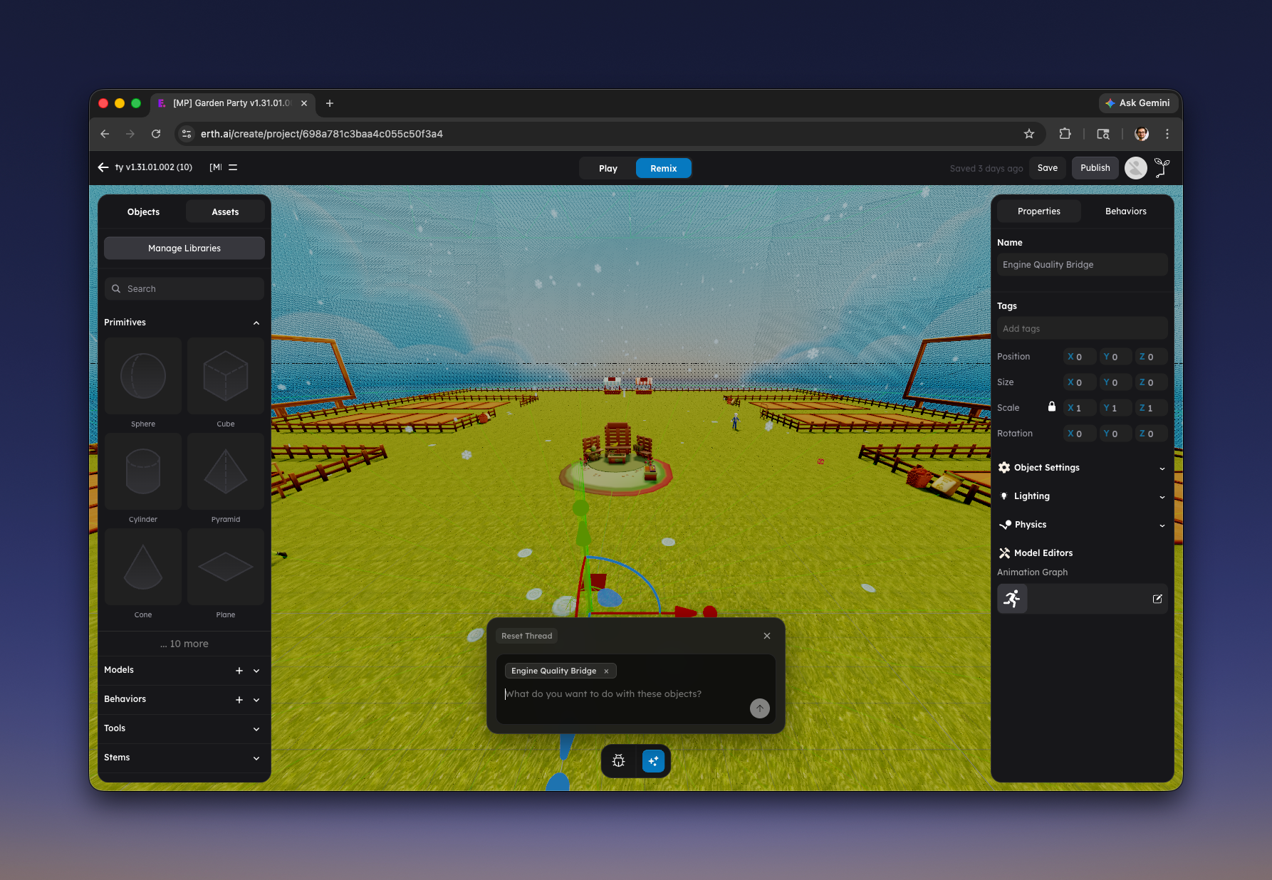 Erth.ai is a browser-based, AI-enabled game engine—anyone can generate 3D models, assets, and interactive experiences through a prompt interface. I joined as PM with end-to-end accountability for the editor, running user research with alpha testers and shaping design with the CEO and CTO. Signal was entirely qualitative; we had no dashboard to hide behind.