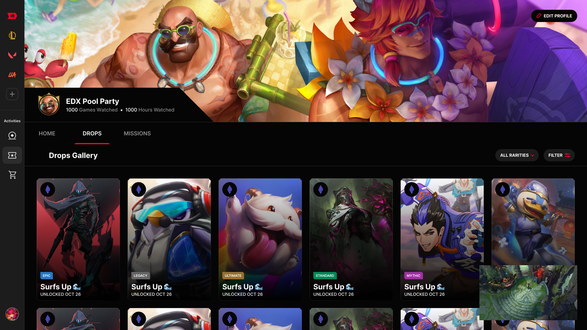 The left panel shows real-time game state (gold diff, per-player stats, team comps) and a live event feed. The right panel houses chat and a rewards system where watching earns in-game League items—a loop only Riot could close, and a core reason to build platform-native viewing habits.