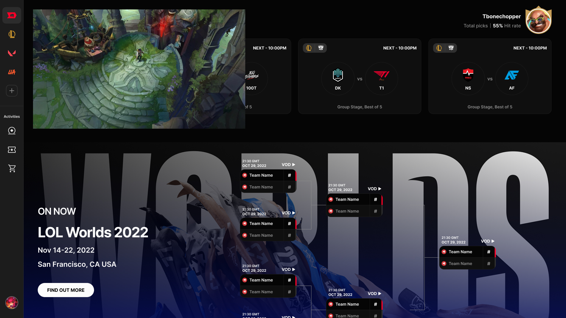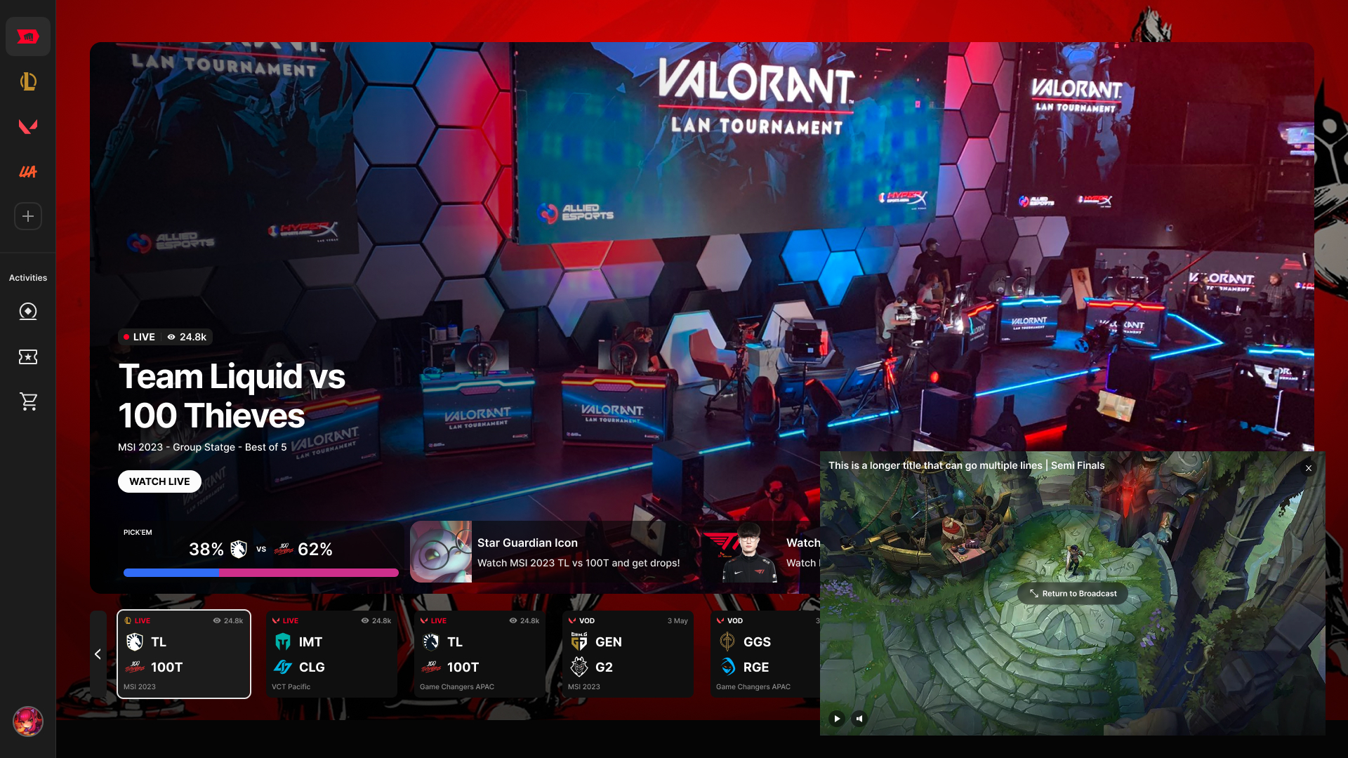 Riot runs some of the most-watched esports in the world—but fans were fragmented across Twitch, YouTube, and third-party sites. Riot Esports Network (REN) was the ambition to bring them home. I joined as part of Riot's acquisition of Kanga.gg, where I was lead designer, and took on the live watch experience from brief to shipped components.
